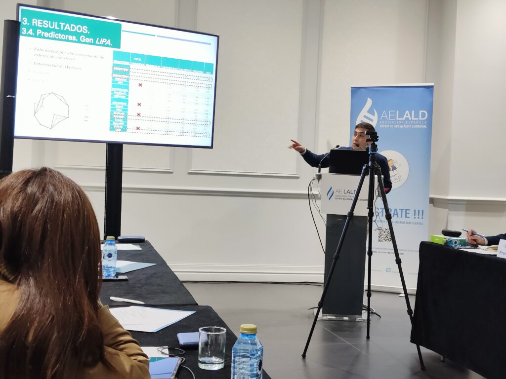 Isidro Arévalo, investigador predoctoral de la Universidad de Zaragoza y perteneciente al equipo de FEETEG, realizó una presentación sobre el estudio Evaluación de predictores relacionados con el análisis genético en LAL-D.